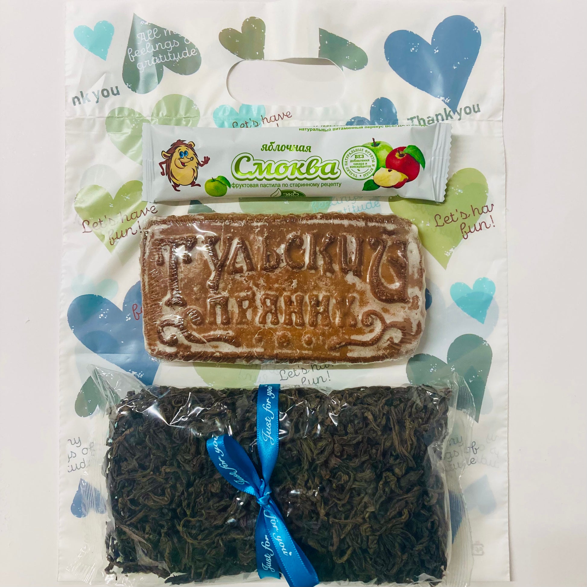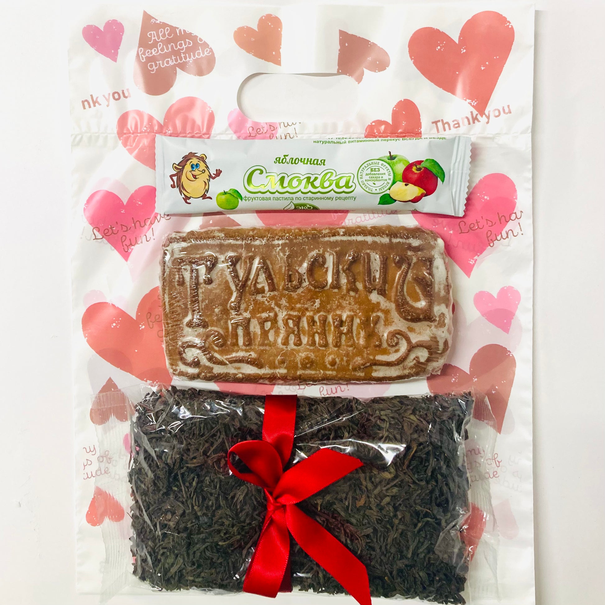 リンゴペースト入りプリャーニキ、フルーツシート”スモクヴァ”リンゴと紅茶セット(袋付き)