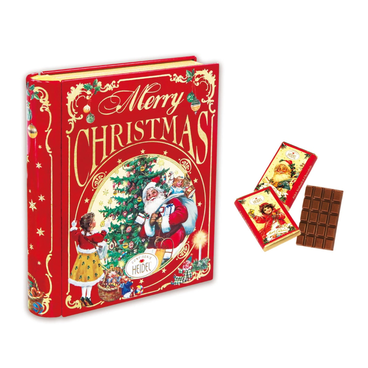 ブック缶の中にクリスマス柄のミルクチョコが入っています。食べた後は、小物入れにお使いいただけます。