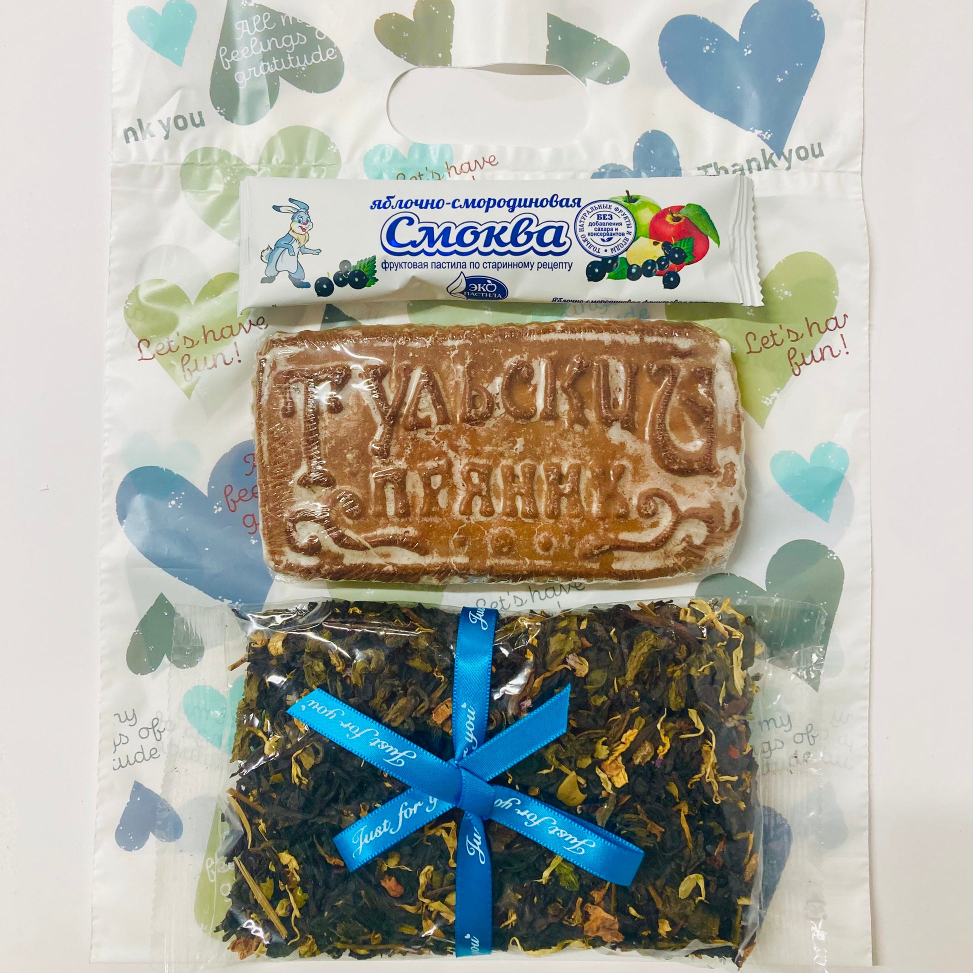 ブラックカラントペースト入りプリャーニキ、 ブラックカラントフルーツシート”スモクヴァ”と紅茶セット(袋付き)